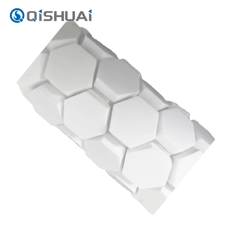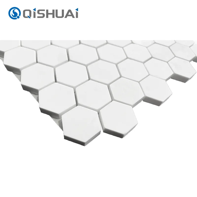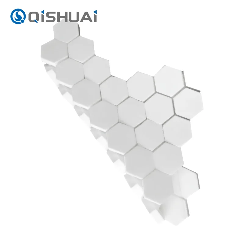 กระเบื้องโมเสกเซรามิก Hex Alumina คุณภาพสูงของบริษัท Shandong Qishuai Wear-Resistant Equipment Co., Ltd. ดังที่แสดงไว้ โดยมีการออกแบบรูปทรงหกเหลี่ยมที่โดดเด่นซึ่งทำให้กระเบื้องเหล่านี้แตกต่างจากกระเบื้องสี่เหลี่ยมจัตุรัสหรือวงกลมทั่วไป กระเบื้องโมเสกเซรามิกอลูมินาหกเหลี่ยมแต่ละชิ้นมีขอบเรียบลื่นพร้อมรายละเอียดประณีตที่มองเห็นได้ชัดเจน